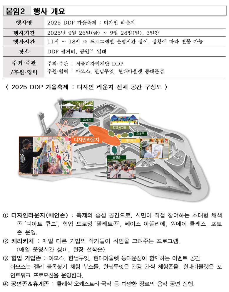 이번 축제는 지역 상권과 기업도 함께 참여한다. 아모스는 블록스 프루티 구미를 활용한 체험 부스를, 한닙두잇은 건강 간식을 나누는 이벤트를 준비한다. 현대아울렛 동대문점은 특별 프로모션과 연계 클래스를 운영해 ‘도심 속 디자인 장터’의 면모를 강화한다.