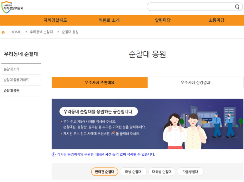 ‘우리동네 순찰대’는 반려견 순찰대, 러닝 순찰대, 자율방범대 등 주민참여 순찰대의 활동 현황과 신청 안내, 활동가이드, 우수사례 게시.추천 기능을 통합한 온라인 플랫폼으로서 시민이 참여형 치안 활동을 보다 쉽게 이해하고 참여할 수 있도록 구성됐다.