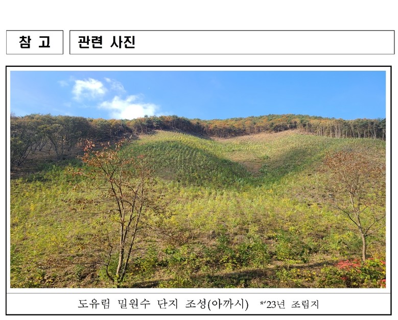 지역특화조림은 환경오염 및 기후 위기에 대응한 밀원수 조림 사업으로 충북도는 2023년부터 집중적으로 도유림 내 밀원수 단지를 조성하고 있다. 아까시, 쉬나무 등 채밀 가능한 주요 밀원수종을 조림하고 지속적으로 그 규모를 확대해 오는 ’28년까지 53ha의 단지 조성을 완료할 예정이며, 이는 꿀벌 감소로 어려움을 겪고 있는 도내 양봉산업 활성화에 기여하고 생태계 보호에 중요한 역할을 할 것으로 기대하고 있다.