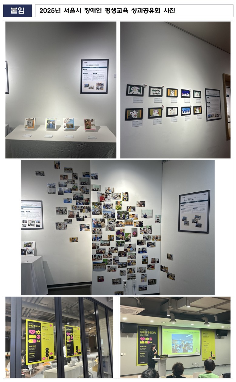 행사장인 서울시민대학 동남권 캠퍼스 2층 시민갤러리에서는 ‘찾아가는 장애인 평생교육 전문 강사 지원 사업’ 결과물과 현장 사진 전시가 열려, 서울시 장애인 평생교육 현장과 학습자 변화 과정을 시각적으로 전달했다.