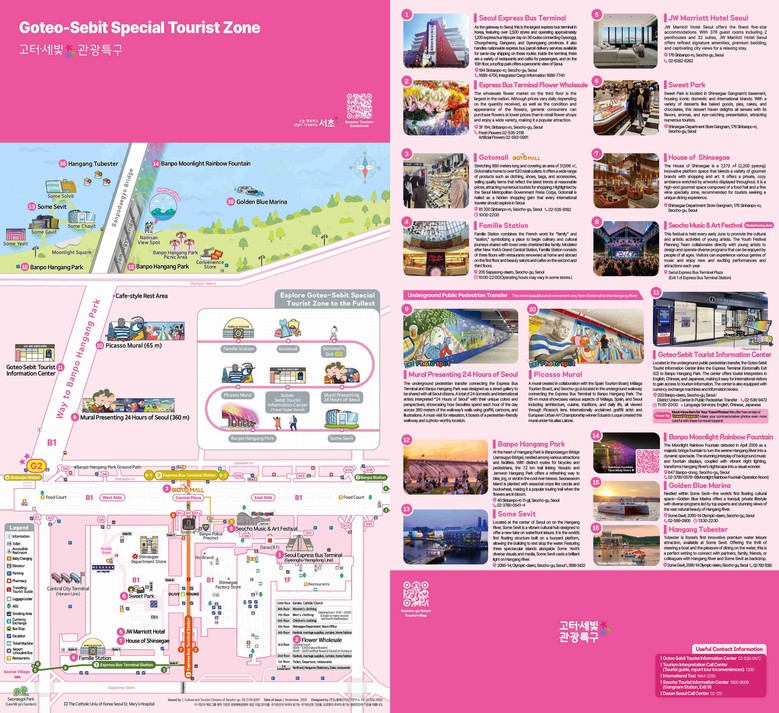 이외에도 ‘고터·세빛 관광특구 안내지도’를 추가 제작해 날씨와 상관없이 안전하게 고투몰(G2번 출구)에서 반포한강공원으로 이동할 수 있는 지하 공공보행통로 위치 등 현장에서 바로 파악하기 쉬운 세부 정보를 담았다. 특구를 방문하는 일본인 관광객의 비율이 높아 기존 국·영문 버전에 일문을 추가한 국·영·일문 3개 언어 버전으로 제작해 여행자가 더 쉽고 알차게 관광을 즐길 수 있을 것으로 보인다. 제작된 지도는 구청 홈페이지에 공개하고 서울시 소재 관광안내센터 8개소에도 비치했다.