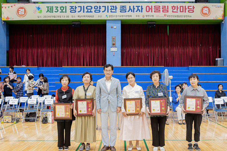 | ▲ ‘양천구 장기요양기관 종사자 어울림 행사’에서 우수종사자 표창 후 기념촬영 중인 이기재구청장 |