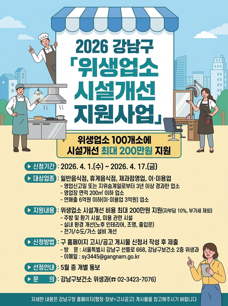 조성명 강남구청장은 “위생업소의 시설개선은 영업환경은 물론 이용 만족도와 업소 경쟁력에도 직결되는 중요한 부분”이라며 “현장에서 체감할 수 있는 지원을 통해 소상공인의 부담을 덜고 안정적인 영업 기반을 마련할 수 있도록 힘쓰겠다”고 말했다.