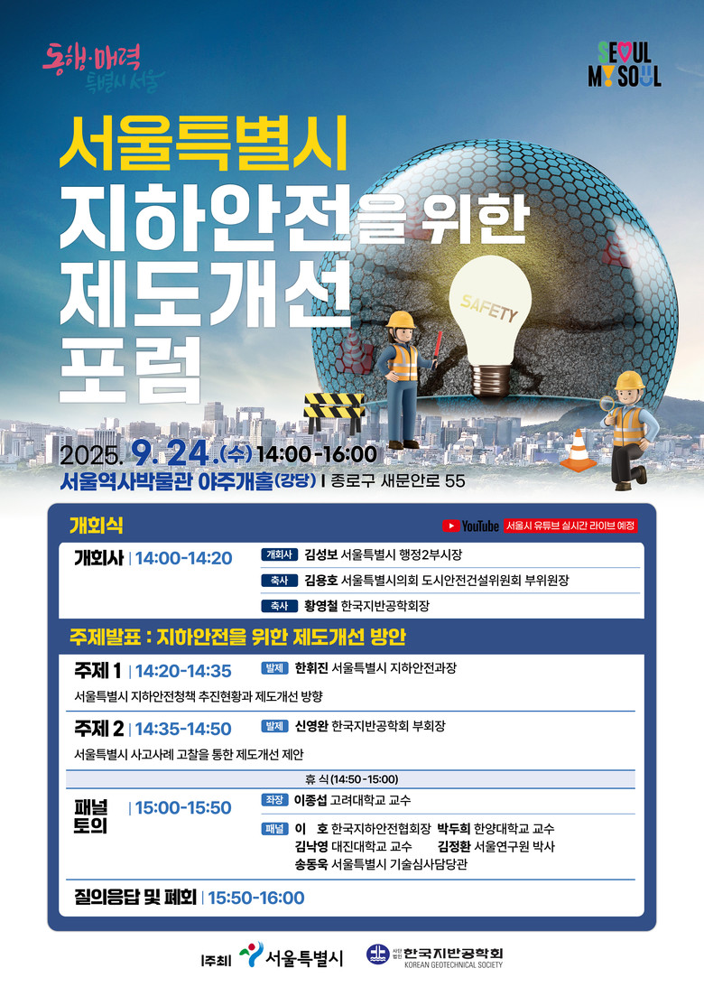 이번 포럼은 행사 당일 서울시 공식 유튜브 채널(www.youtube.com/seoullive)에 생중계되며, 지하안전 제도개선에 관심 있는 누구나 별도의 사전 등록 없이 현장 참석할 수 있다.