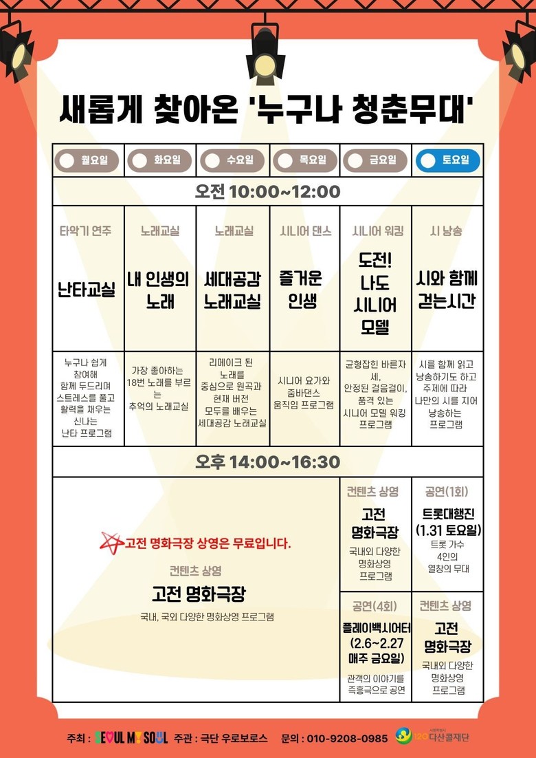 시범 운영 프로그램은 오전 참여형 프로그램과 오후의 영화·공연 콘텐츠 상영으로 구성된다. 오전(10~12시)에는 어르신 신체·정서·사회적 활력을 높이는 프로그램이 운영되고, 오후(2시~)에는 ‘고전 명화극장’을 통해 국내외 다양한 영화가 상영된다. 또한 매주 금요일 관객의 이야기를 공연으로 재구성하는 ‘플레이백시어터 <당신의 이야기>’를 운영하고, 오는 31일에는 트롯 가수들이 참여하는 특별공연 ‘트롯대행진’이 진행된다.