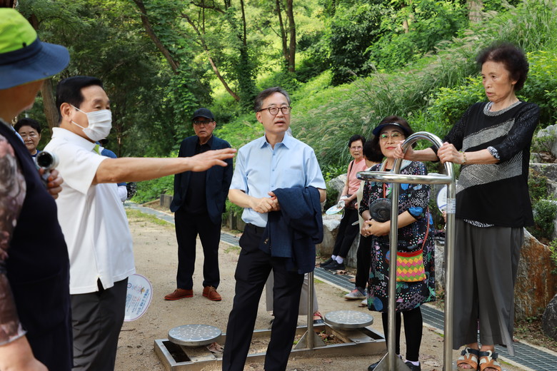 반가워하던 주민들은 곧이어 유 구청장에게 어려움을 꺼내놓았다. 이 근방에 산다는 황충관(80) 씨는 “이곳에서 매일 30~40명이 정기적으로 운동을 한다”며 “다만 지붕이 없어 비가 올 때는 어쩔 수 없이 운동을 쉬어간다”고 아쉬움을 토로했다. 시흥2동 주민인 이연옥(67) 씨 역시 “안전하게 운동을 하고 싶다”며 “일부 빗물에 흙이 떠내려가 바닥이 패인 곳도 있다”고 설명했다.