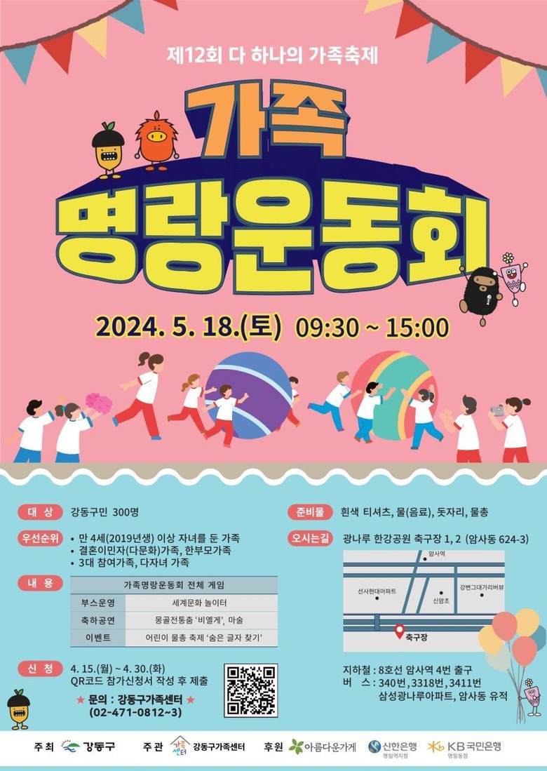 사전 신청은 4월 15~30일 포스터 하단의 QR코드를 통해 온라인으로 접수할 수 있고, 만 4세(2019년생) 이상 자녀가 있는 강동구민이라면 누구나 참여할 수 있다. 기타 자세한 사항은 ‘강동구가족센터’ 누리집 또는 카카오톡 채널을 통해 안내받을 수 있다.