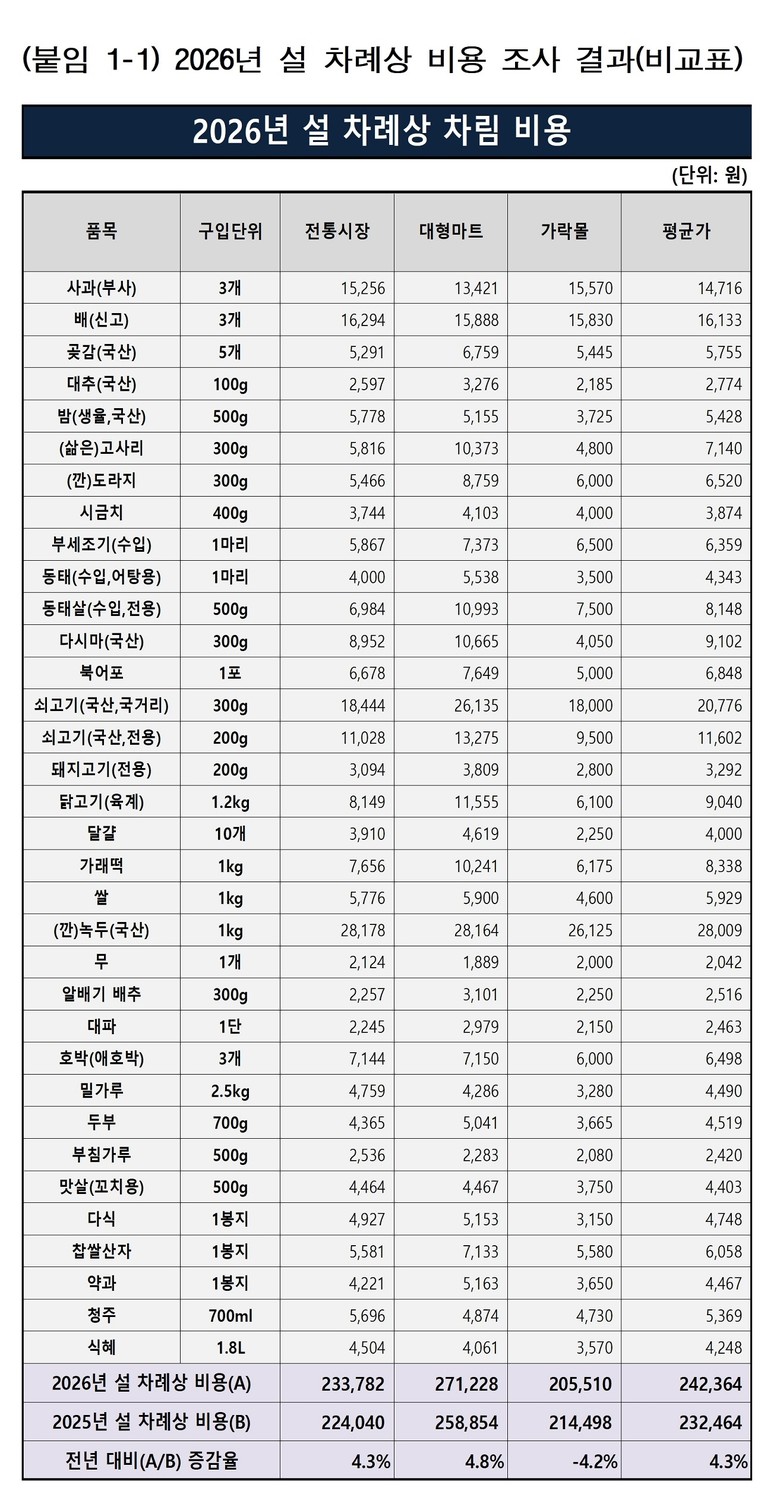 공사는 명절(설·추석) 차례상 차림에 수요가 높은 주요 성수품 34개 품목(6~7인 가족 기준)의 구매비용을 조사해 매년 발표하고 있으며, 금년도 조사 결과 올해 전통시장 구매비용은 233,782원, 대형마트 구매비용은 271,228원으로 전년 대비 각각 4.3%, 4.8% 상승했다.
