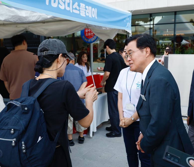 | ▲ 진교훈 강서구청장(오른쪽)이 13일(토) 마곡 일대에서 열린 ‘MCT페스티벌’을 찾아 시민들과 인사를 나누고 있다. |