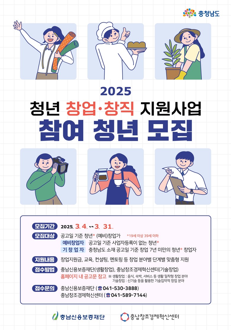 자세한 자격 요건 및 신청 방법 등은 △생활업종 충남신용보증재단(☎ 041-530-3888), 누리집(공고문) △기술업종 충남창조경제혁신센터(☎ 041-589-7144, 7147), 누리집(공고문)을 통해 확인할 수 있다.