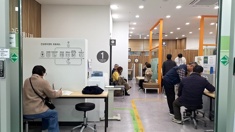 | ▲ 구로구보건소 건강관리센터를 방문한 주민들이 대사증후군 검진과 건강상담을 위해 대기하거나 설문지를 작성하고 있다. |