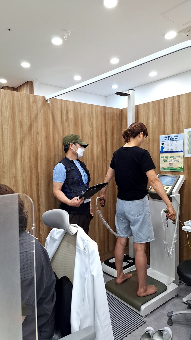 | ▲ 구로구보건소에서 한 주민이 대사증후군 검사를 위해 체성분 측정을 하고 있다. |