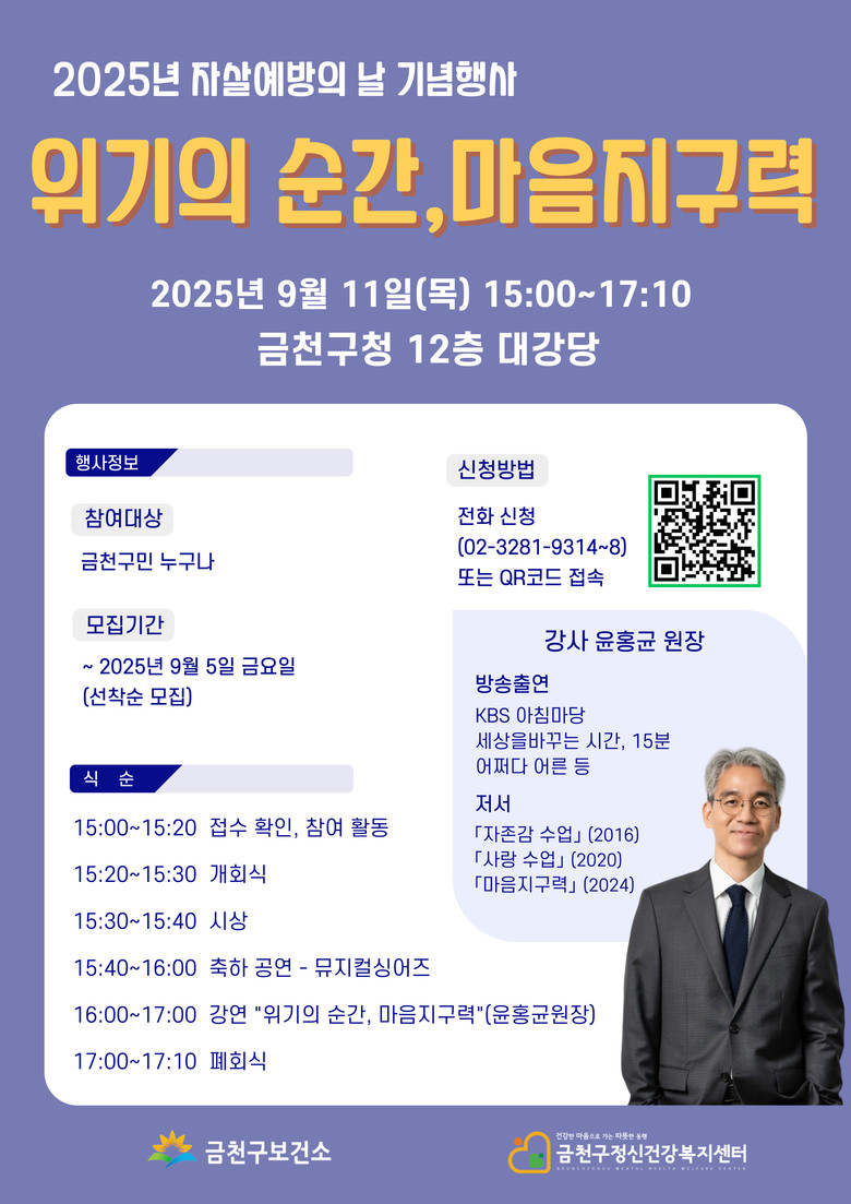 이번 행사에서는 KBS ‘아침마당’, 인기 강연프로그램 ‘세상을 바꾸는 시간, 15분(세바시) 등 다양한 방송 매체에 출연한 바 있는 윤홍균 정신건강의학과 전문의를 초청하여 ‘위기의 순간, 마음지구력’을 주제로, 따뜻한 위로를 주는 자살예방 강연을 듣는다.