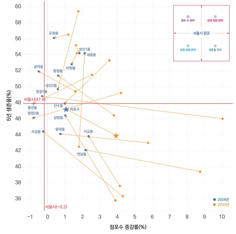 상권의 안정성을 가늠할 수 있는 핵심 지표인 생존율은 전년 대비 증감률을 함께 제시해 각 자치구의 상권 유지력과 회복력을 객관적으로 비교할 수 있도록 했다.