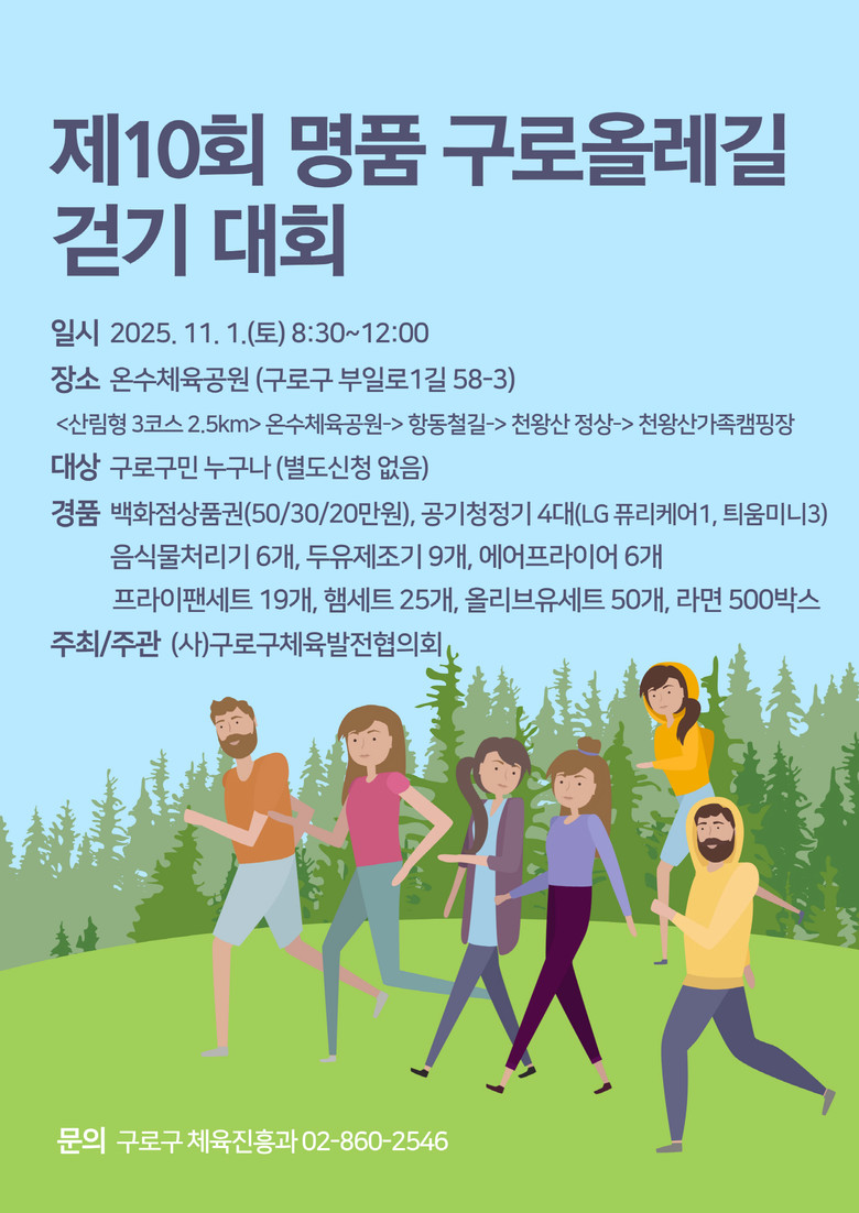이번 걷기 대회는 명품 구로올레길 중 산림형 3코스에서 진행된다. 온수체육공원을 출발해 오정초등학교와 항동철길, 천왕산 정상을 거쳐 천왕산가족캠핑장으로 도착하는 코스로 진행된다. 약 2.5킬로미터(km)로 약 2시간 소요될 예정이다.
