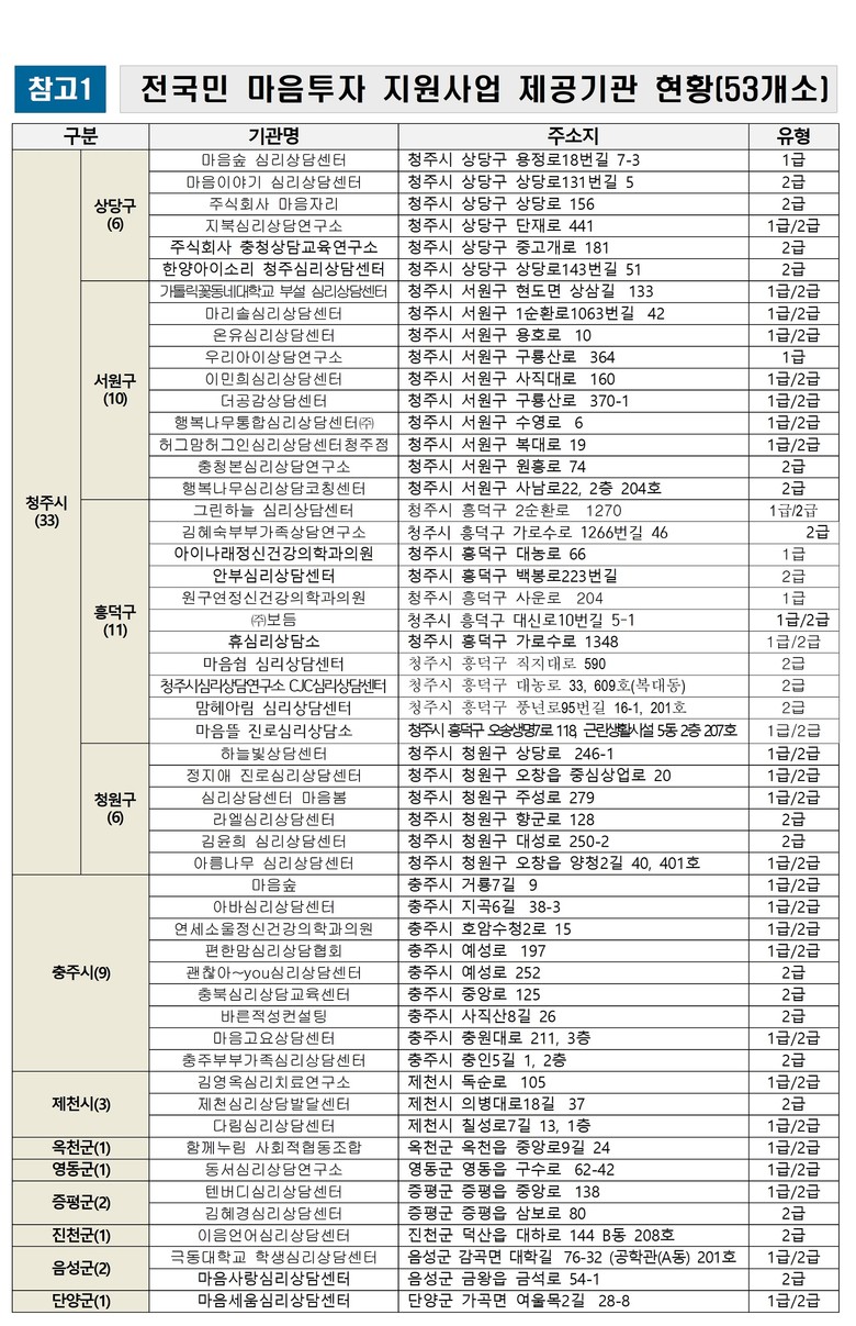 한찬오 충북도 보건정책과장은 “심리적 어려움을 겪는 도민에게 마음투자 사업이 실질적인 도움이 되기를 바란다”라며, “안정적인 사업 추진을 통해 마음이 건강한 충청북도가 될 수 있도록 노력하겠다”라고 말했다.