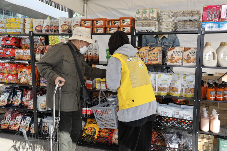 훈훈한 별천지 겨울마켓은 관내 취약계층 300가구가 필요한 물품을 직접 골라 가져가는 방식으로 운영됐다. 매대에는 겨울을 앞두고 김치, 방한용품, 식료품 선물세트 등이 진열됐다.