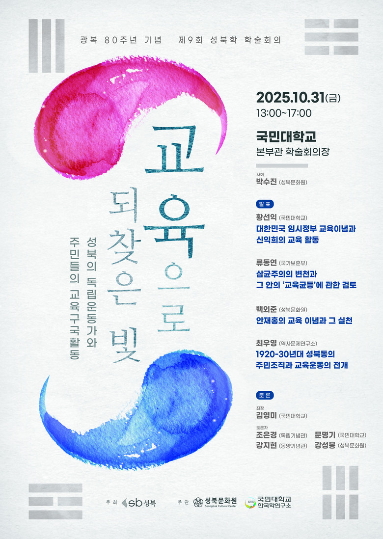 학술회의는 오후 1시부터 5시까지 국민대학교 본부관 학술회의장에서 열리며, 광복 80주년을 맞아 성북 지역 독립운동가와 주민들의 ‘교육구국활동’을 주제로 진행된다.
