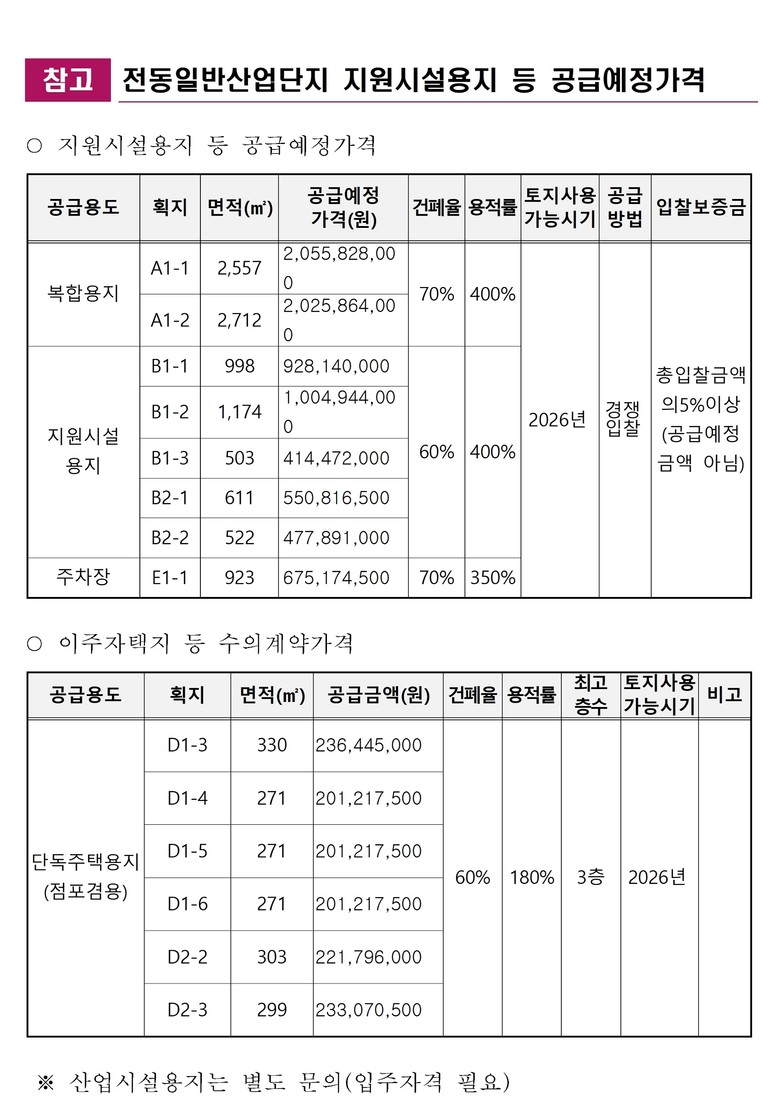 한편, 시는 전동일반산업단지 내 잔여 산업시설용지(6획지)와 이주자택지(6획지)에 대해서도 수의계약 방식으로 상시 분양을 진행 중이다.