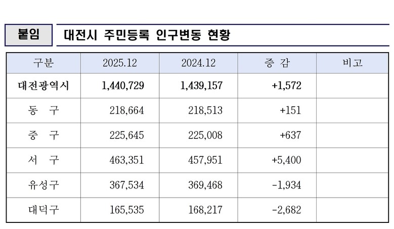 대전시 인구는 행정안전부 주민등록 인구통계를 분석한 결과, 2025년 12월 말 기준 144만 729명으로 나타났다. 이는 지난해 말(1,439,157명) 대비 1,572명이 증가한 수치다.