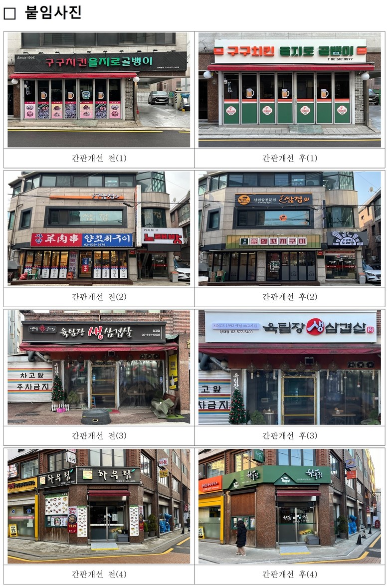 서초구는 상인들의 의견을 적극 반영하여 가게별 특성에 맞는 창의적이고 시인성 높은 간판을 제작하였고, 불필요한 돌출간판을 정비해 보행 안전을 확보하고 쾌적한 보행환경을 조성했다. 또한 단순히 간판 정비ˑ교체에 그치지 않고 간판이 설치된 건물의 외벽 도색ˑ세척과 파사드 정비를 병행하여 건물과 거리 전체의 분위기를 개선했다.