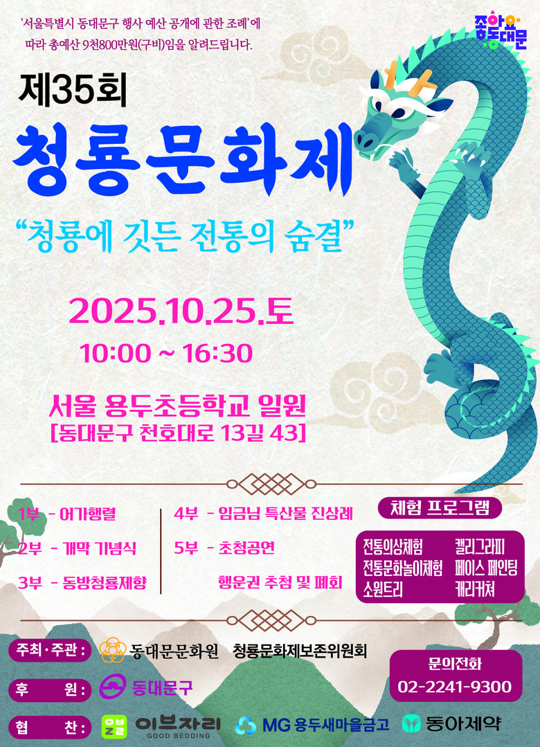 이필형 동대문구청장은 “청룡문화제는 조선시대 임금이 직접 참여했던 기우제를 지역의 손으로 되살린 뜻깊은 행사”라며, “올해는 정식 어가행렬 부활을 통해 역사적 의미를 더하고, 아이와 가족이 함께 즐길 수 있는 다채로운 체험 프로그램으로 전통과 현대가 공존하는 문화도시 동대문구의 매력을 느낄 수 있을 것”이라고 전했다.