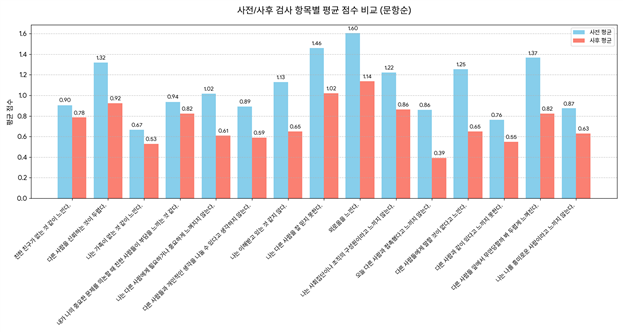 두 프로그램 운영 이후, 참여자 전원을 대상으로 실시한 고립감 척도 검사 결과에서도 객관적 변화가 확인됐다. “다른 사람들에게 말할 것이 없다고 느낀다”는 응답은 1.25점에서 0.65점으로 0.61점 감소했고, “다른 사람들 앞에서 무안당할까 두렵다”는 항목은 1.37점에서 0.82점으로 0.54점 줄어들었다. 프로그램을 통해 소통에 대한 두려움과 대인관계 불안이 뚜렷하게 완화된 결과다.