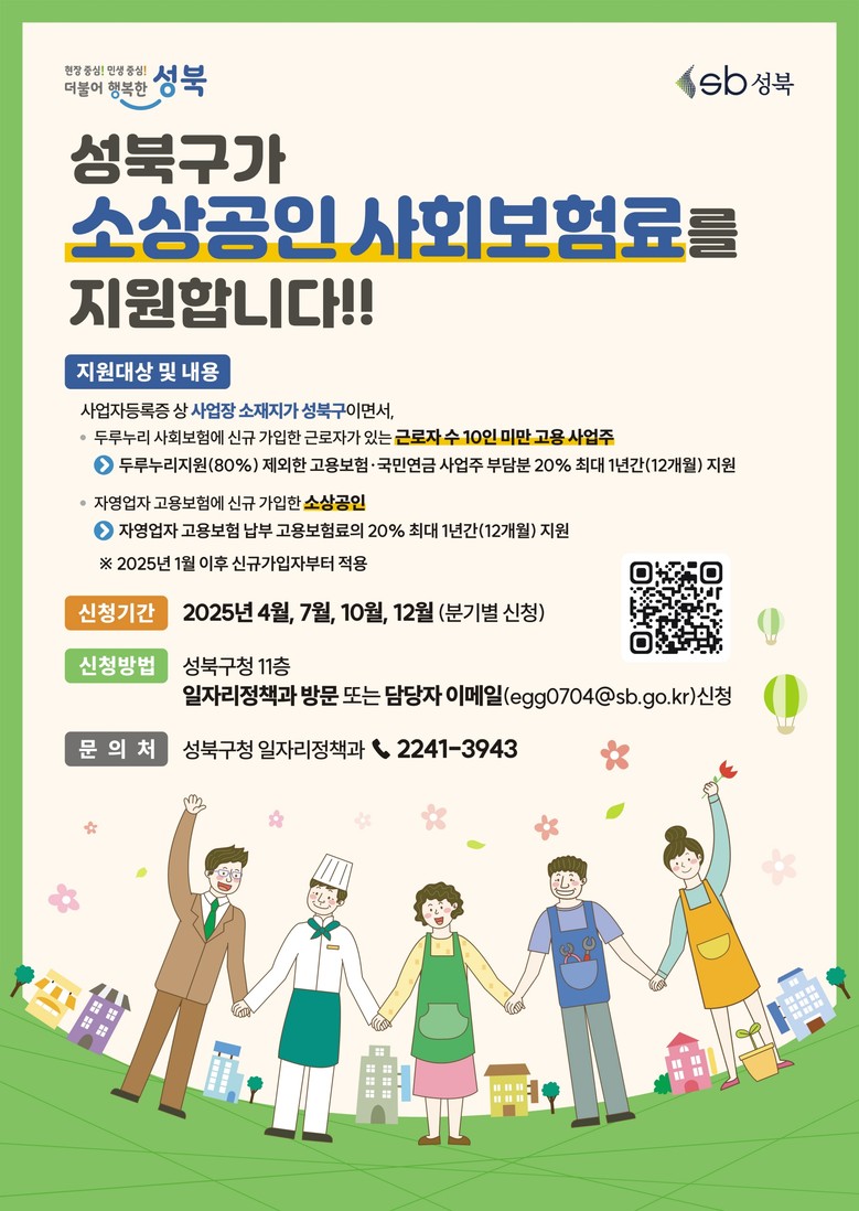 지원 대상은 사업자등록증 상 사업장 소재지가 성북구인 경우로, 정부 두루누리 사회보험료 지원사업에 신규 가입한 근로자가 있는 근로자 수 10인 미만 고용 사업주와 자영업자 고용보험에 신규 가입한 소상공인이다.