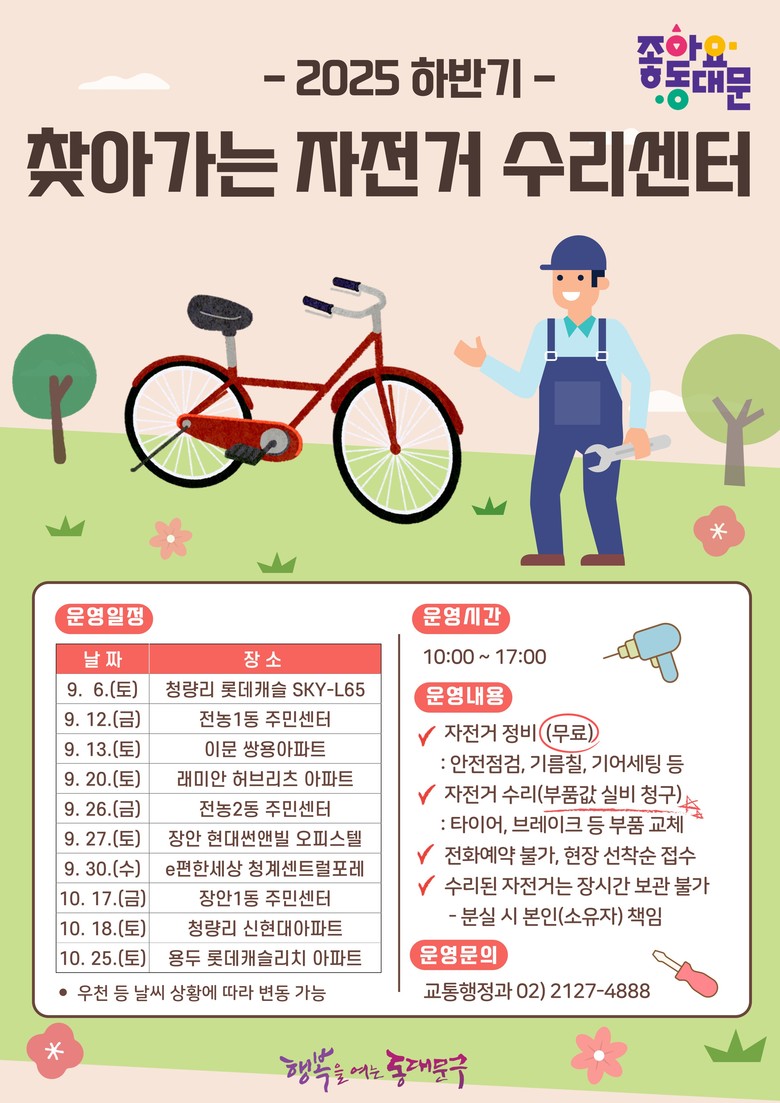 - 자전거 안전점검, 기름칠, 기어 세팅 등 무료 제공 [동대문구 세계타임즈=이장성 기자] 서울 동대문구(구청장 이필형)는 자전거 이용 활성화와 교통복지 향상을 위해 9월부터 10월 말까지 약 2개월간 ‘찾아가는 자전거 수리센터’를 운영한다고 밝혔다.