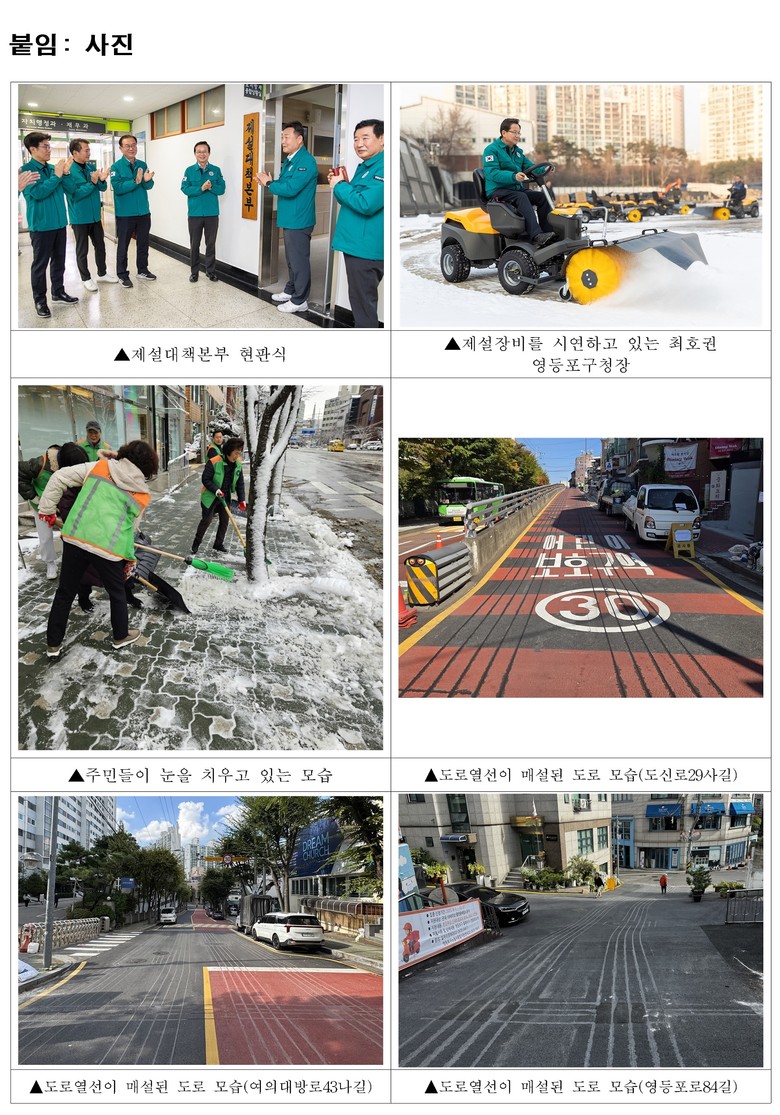최호권 영등포구청장은 “관내 모든 도로를 촘촘히 대비하는 제설 대책을 마련했다”라며 “구민 여러분께서도 ‘내 집 앞ㆍ내 점포 앞 눈 치우기’에 함께해 주신다면 보다 안전한 겨울을 만들어 갈 수 있을 것”이라고 전했다.