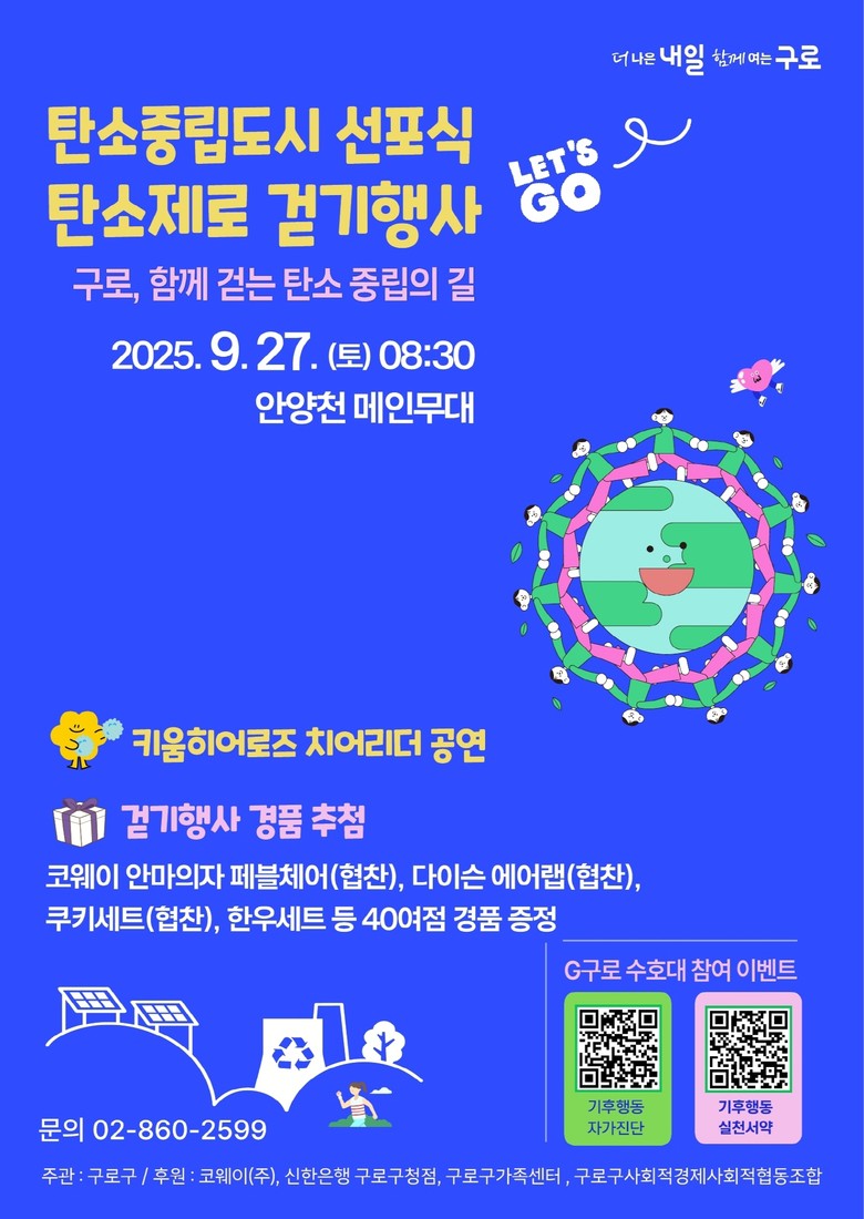 - 2부 행사로 ‘탄소제로 걷기 행사’…코웨이 안마의자(협찬) 등 40점 경품 이벤트 진행 [구로구 세계타임즈=이장성 기자] 구로구(구청장 장인홍)가 오는 27일 오전 8시 30분 안양천 구로G페스티벌 메인무대에서 ‘구로, 함께 걷는 탄소중립의 길’을 주제로 ‘탄소중립도시 구로’ 선포식을 개최한다.