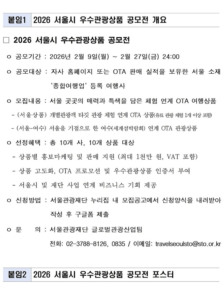 - 市, “글로벌 관광객이 자신만의 여행을 설계할 수 있는 체험형 관광상품 발굴에 힘쓸 것” [서울 세계타임즈=이장성 기자] 서울시와 서울관광재단은 서울의 매력을 즐길 수 있는 체험형 관광상품을 발굴‧육성하기 위해「2026 서울시 우수관광상품 공모전」을 2월 9일(월)부터 27일(금)까지 진행한다.