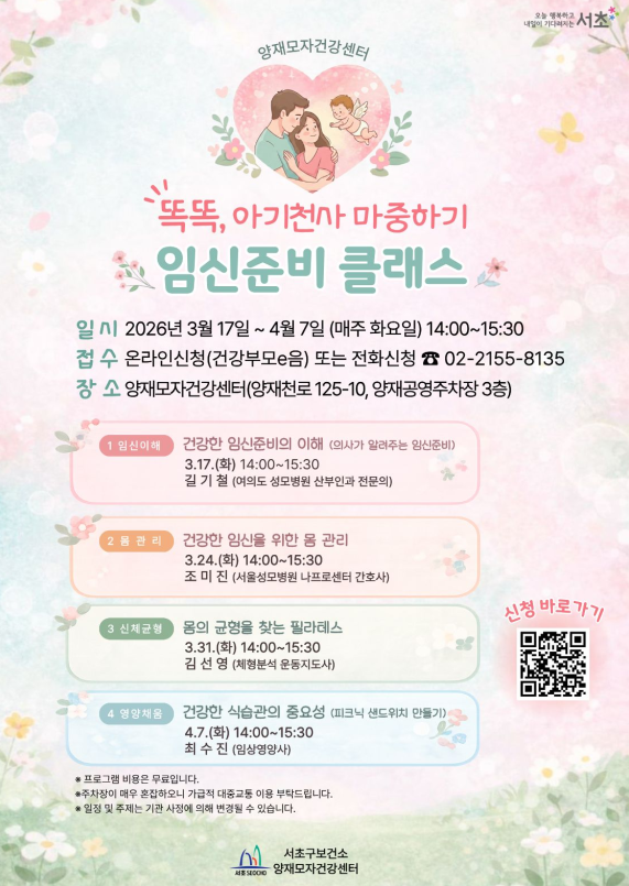 아울러, 중년 여성을 대상으로 한 ‘중년 비만ZERO’ 과정은 갱년기 신체 밸런스 관리와 다이어트 프로그램을 통해 가족 건강의 중심인 여성들의 활력을 지원한다. 양재모자건강센터의 모든 프로그램은 건강부모e음 홈페이지(parents.seocho.go.kr)에서 신청할 수 있다.