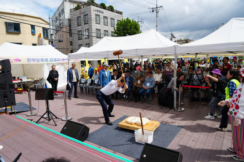▲ 전통시장 한마음 축제에서 이승로 성북구청장이 떡메를 치고 있다