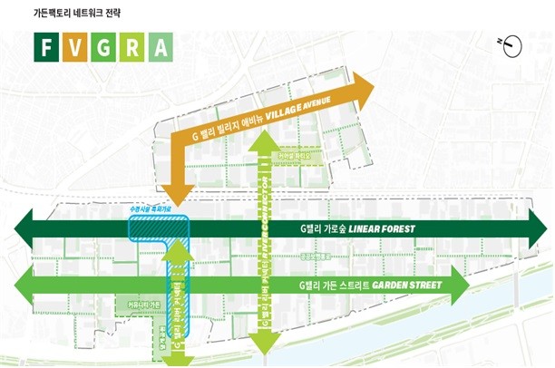 G밸리 가든팩토리의 총면적은 187,364㎡로, 공개공지 135개소, 가로수 2,227주, 띠녹지 4,527㎡ 등을 포함하여 연속적인 녹지축을 형성하는데 중점을 두고 있다. G밸리 내 다양한 녹지공간을 단순히 잇는 것이 아니라 미세먼지와 도로변 소음을 차단할 수 있는 ‘녹지축’을 형성하는데에도 주력한다.