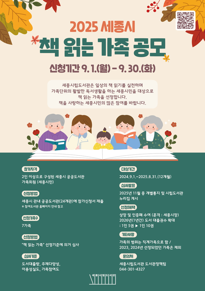 시립도서관 관계자는 “가족이 함께 책을 읽고 독서의 즐거움을 나누는 것은 세종시 독서 문화 확산의 중요한 밑거름”이라며 “책 읽는 가족 공모에 많은 세종시민의 관심과 참여를 바란다”고 말했다.