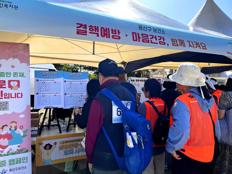 또한 17일에는 이촌한강공원 거북축구장에서 열린 ‘장애인·비장애인 행복한 용산 걷기대회’ 현장에서도 자살예방 홍보부스를 함께 운영했다. OX 퀴즈 방식으로 진행된 참여 프로그램에서는 ▲“자살 사망자는 사망 전 암시 신호를 보인다(O)” ▲“자살예방 상담전화 109는 24시간 무료로 이용할 수 있다(O)” 등의 문항이 출제됐으며, 참여자들에게는 밴드 구급함 등 실용적인 기념품이 제공됐다.