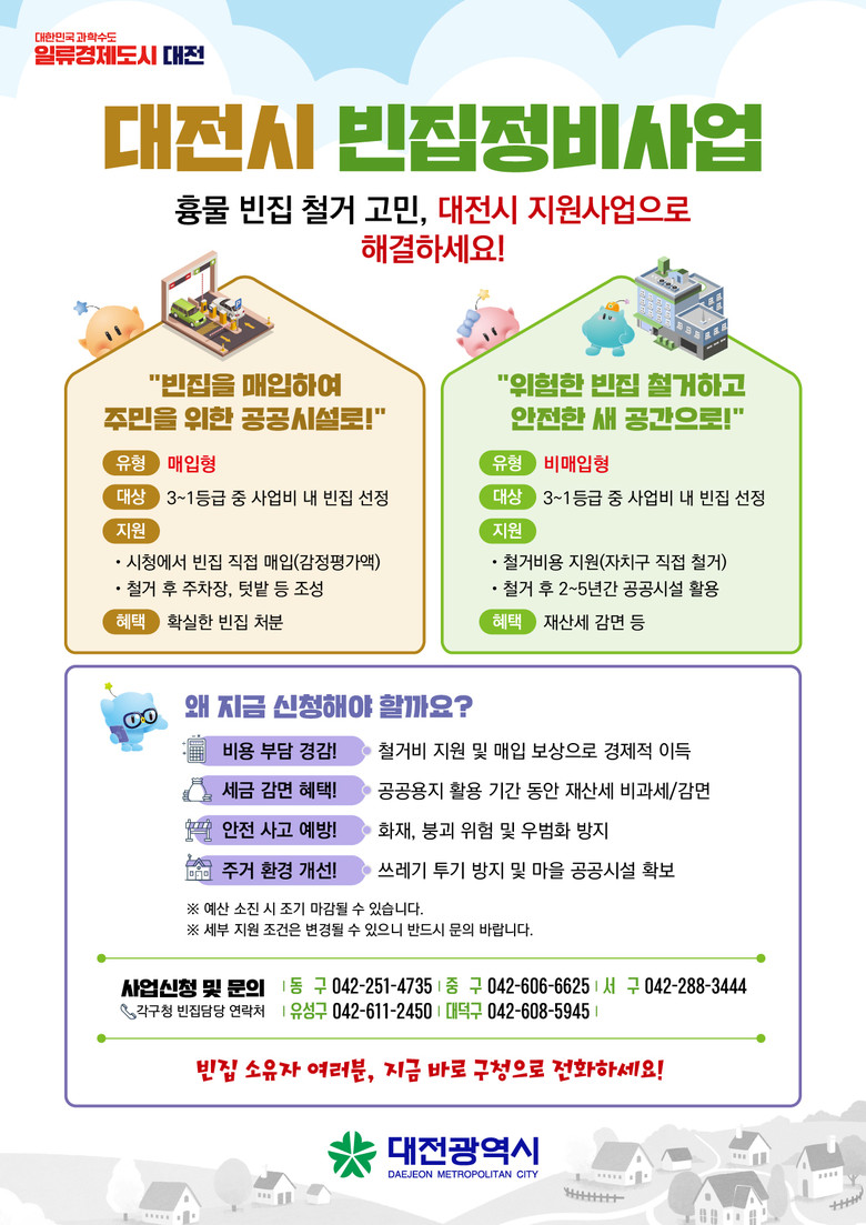 사업 신청 및 자세한 사항은 각 구청, 빈집 정비 담당부서로 문의하면 된다. (동구 ☎042-251-4735 / 중구 ☎042-606-6625 / 서구 ☎042-288-3444 / 유성구 ☎042-611-2450 / 대덕구 ☎042-608-5945)