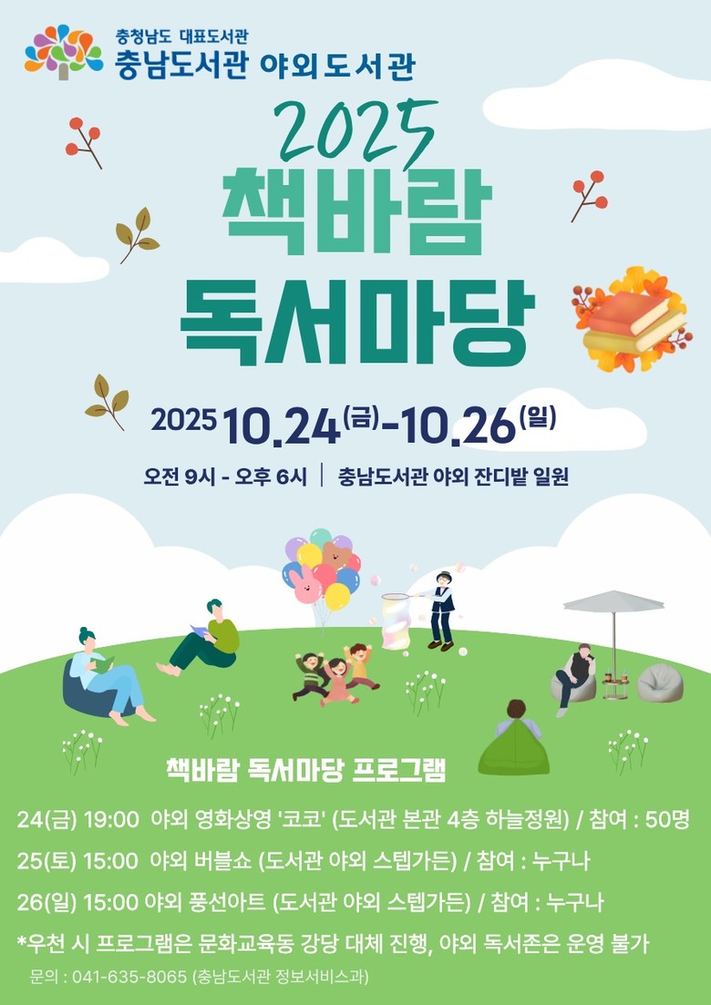 책바람 독서마당은 충남도서관이 실내 독서 공간을 뛰어넘어 자연과 어우러져 독서와 휴식, 체험을 함께 즐기는 야외도서관으로 외연을 넓히고, 도서관 이용객에게 색다른 독서 경험을 제공하고자 추진하는 독서문화 행사다.
