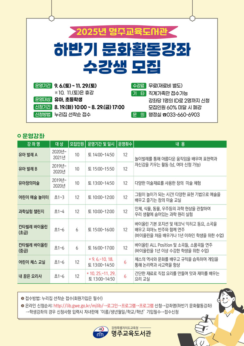 하반기 문화활동강좌에 대한 자세한 내용은 누리집 공지사항을 참고하거나 행정실(☎660-6903)로 문의하면 된다.