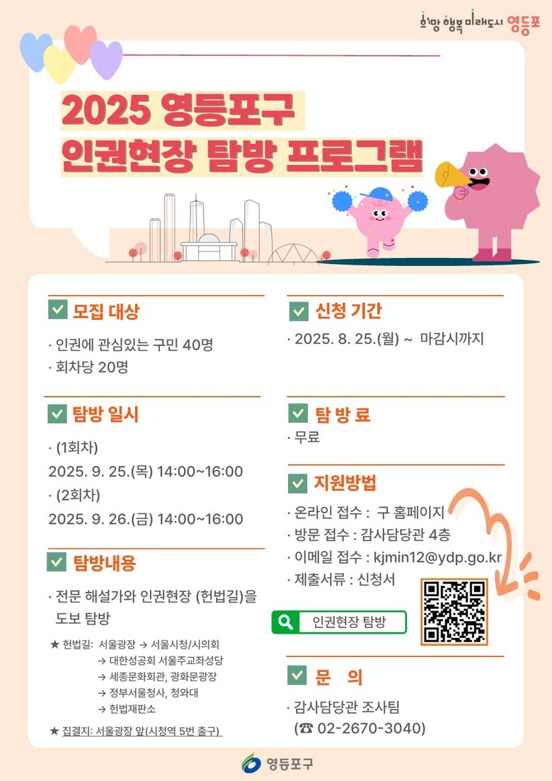 이 외에도 구는 인권의 가치와 소중함이 깃든 장소를 찾아가는 ‘2025년 인권현장 탐방 프로그램’을 25일과 26일 운영한다. 인권에 관심 있는 구민 40명을 대상으로 회차별 20명씩 모집하며, 전문 해설가와 함께 서울광장, 서울시청, 대한성공회 서울주교좌성당, 세종문화회관, 광화문광장, 청와대, 헌법재판소 등 ‘헌법길’ 도보 탐방으로 진행된다. 참가비는 무료이며 선착순 모집 중이다.