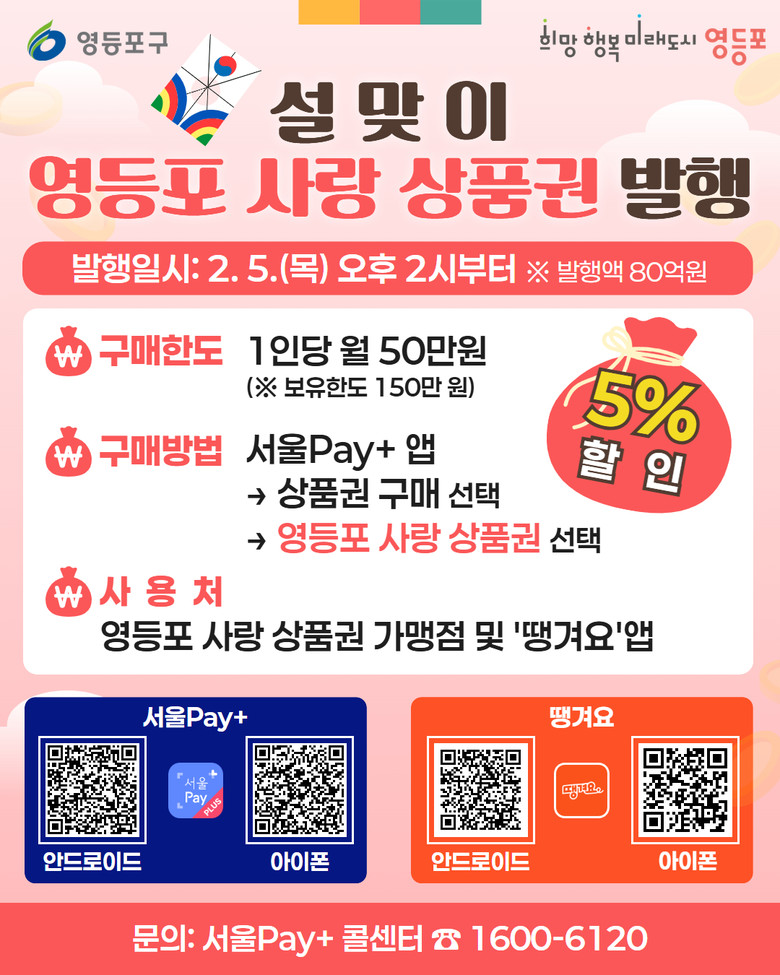 - 올해 ‘영등포땡겨요 상품권’ 50억 발행…최대 28% 할인 혜택 제공 [영등포구 세계타임즈=이장성 기자] 영등포구(구청장 최호권)가 새해를 맞아 위축된 소비 심리를 회복하고 지역 내 소상공인의 매출 증대를 돕기 위해 오는 2월 5일 오후 2시부터 총 80억 원 규모의 ‘영등포 사랑상품권’을 발행한다고 밝혔다.