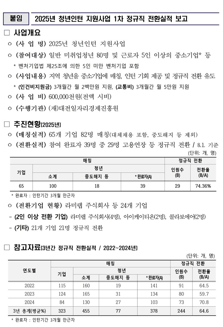 지난 2022년부터 2024년까지 3년간 323개 기업이 참여했으며, 총 378명의 청년이 인턴 과정을 마쳤다. 이 가운데 244명이 정규직으로 전환돼 평균 전환율은 64.6%에 달했다. 연도별 전환율은 2022년 64.5%, 2023년 59.7%, 2024년 70.8%로, 최근 들어 상승하는 추세를 보이고 있다.