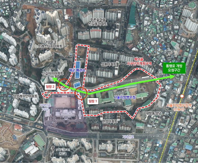 현재 신림선 병무청역 개통으로 병무청 부지는 일부 개방됐으나, 인접한 국방부 부지(해군 폐관사)는 여전히 통행이 제한돼 주민 불편이 이어지고 있다. 구는 폐관사 철거 후 임시 보행로를 마련해 불편을 최소화하고, 새로 들어설 서울지방병무청 신청사가 ‘담장이 없는 열린 청사’로 건립될 수 있도록 지속 협의할 계획이다. 또 청사 내 주민 이용 공간을 확보해 정원과 산책로, 휴게 공간 등을 조성하고, 누구나 자유롭게 이용할 수 있는 힐링 공간이 마련되도록 적극 요청할 예정이다.