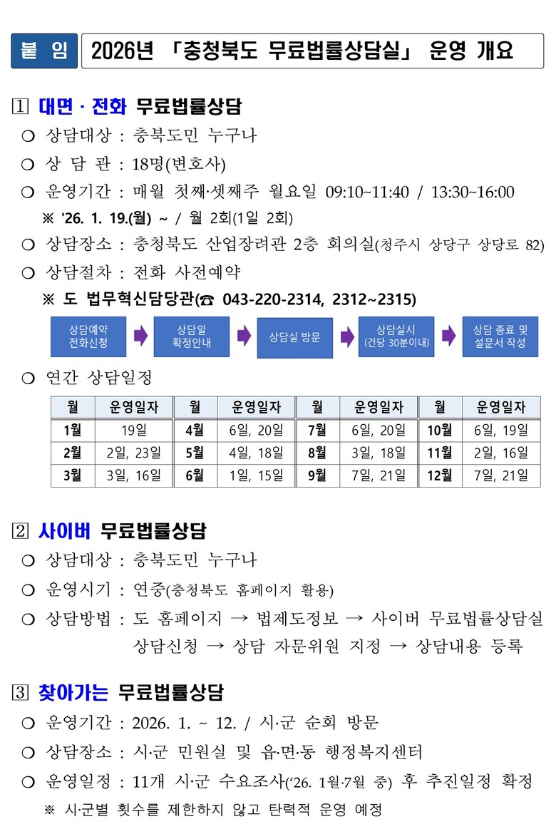 [충북 세계타임즈=이현진 기자] 충북도는 19일, 2026년 첫 대면·전화 무료법률상담 일정을 시작으로 「2026년 충청북도 무료법률상담실」 운영을 본격적으로 시작할 계획이라고 밝혔다.