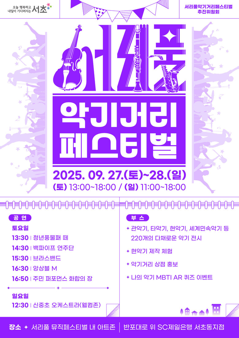 축제의 하이라이트인 공연 무대 역시 풍성하게 꾸며진다. 27일(토) 서리풀뮤직페스티벌 내 아트존에서 선보이는 서리풀 악기거리 축제 개막식에는 청년풍물패의 흥겨운 고창농악공연이 울려 퍼지고 한국 백파이프 연주단, 브라스밴드, 현악 5중주 앙상블 무대가 이어진다. 이후 주민, 연주자, 악기 상인들이 함께 참여하는 대규모 합주 퍼포먼스가 펼쳐져 모두가 주인공이 되는 화합의 장을 연출할 것으로 기대를 모은다. 마지막으로 28일(일) 웰컴존에서 예정된 신중초등학교 오케스트라 공연에서는 아이들이 클래식 명곡들을 연주하며 서리풀뮤직페스티벌의 감동을 이어나간다는 계획이다.
