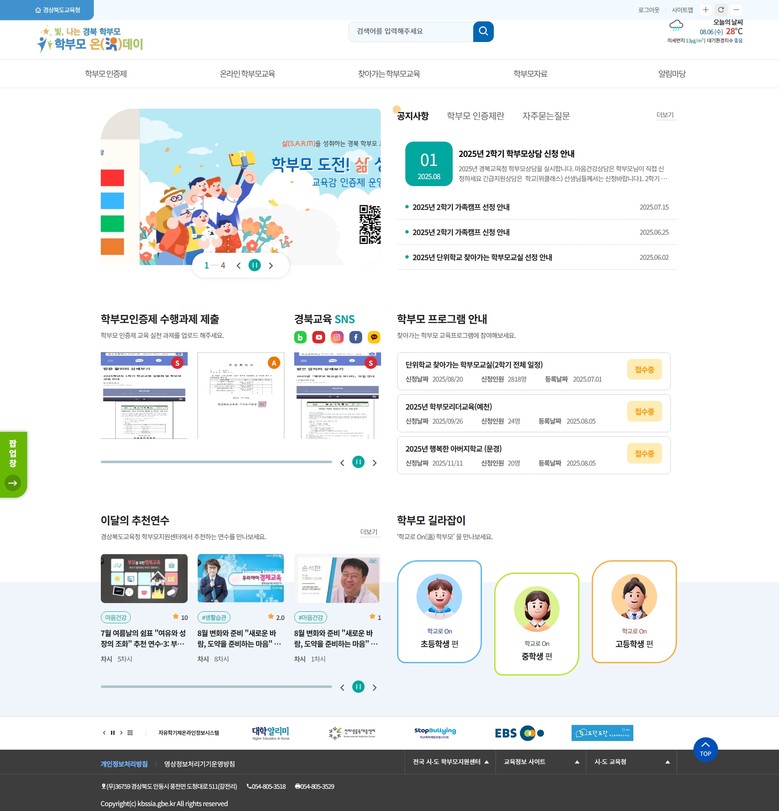 아울러, 경북교육청의 ‘학부모 교육자료’, 교육부의 ‘학부모 가이드북’ 등 유용한 자료를 홈페이지에서 직접 열람·다운로드 할 수 있도록 구성했으며, 인스타그램, 블로그, 페이스북 등 SNS 채널과도 연계하여 접근성을 높였다. 특히 국가평생교육진흥원이 운영하는 ‘학부모 온(On)누리’ 연수 프로그램도 이달의 추천 연수 코너를 통해 바로 접속 가능하다.