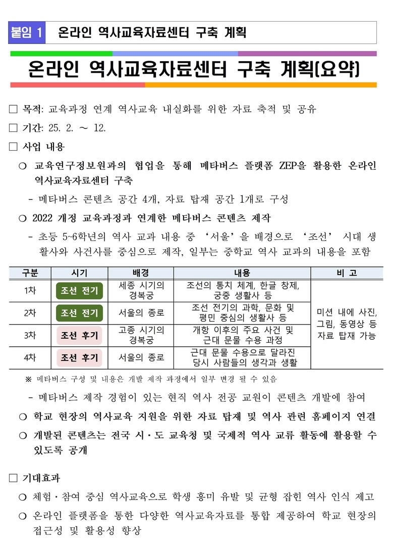 서울시교육청은 온라인 역사교육자료센터를 통해 학생 참여와 흥미를 높이고, 교사의 수업 준비 부담을 줄이는 한편, 전국적으로 활용 가능한 공유형 역사교육 플랫폼을 제공할 계획이다.