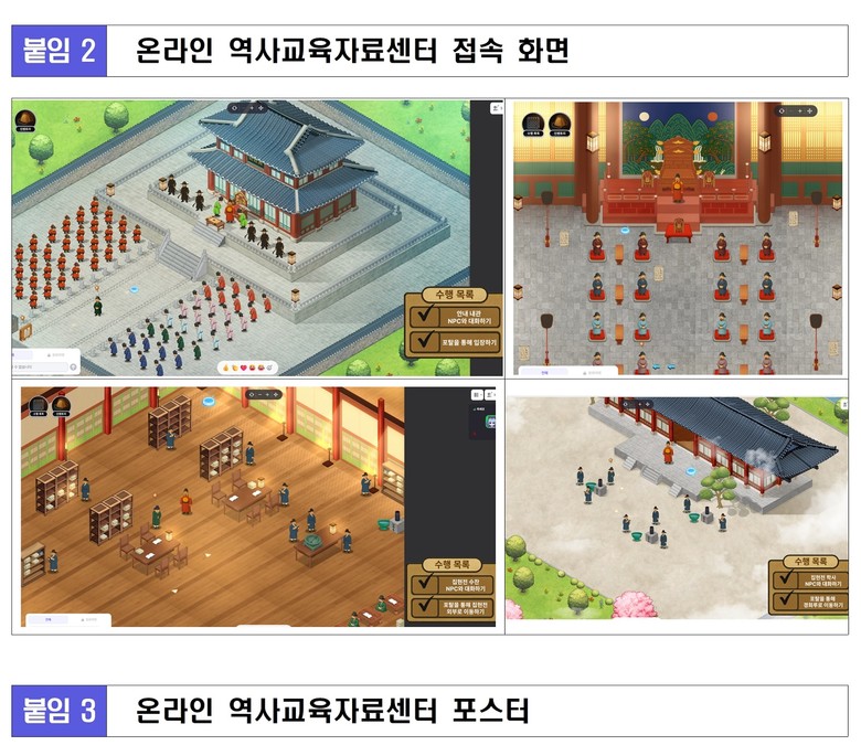 참여자는 가상 공간에서 미션을 수행하며 역사적 상황을 직접 체험할 수 있고, 사진·영상 등 자료와 연계한 탐구 기반 학습도 가능하다. 역사 관련 자료를 축적하는 아카이브 공간도 마련돼 학교 현장의 수업 지원에 활용된다.