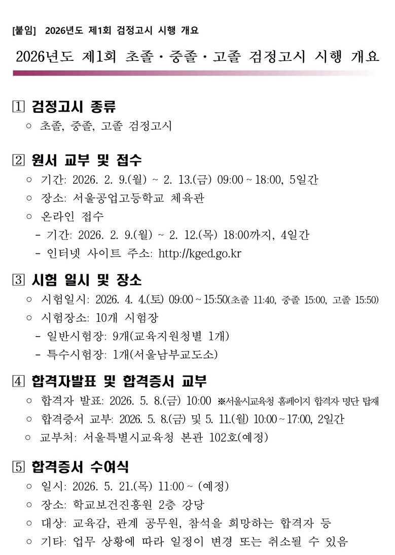 접수처 혼잡도 완화를 위해 ‘온라인 원서 접수 적극 권장’ [서울 세계타임즈=이장성 기자] 서울특별시교육청(교육감 정근식)은 2월 3일(화) 서울시교육청 누리집에 「2026년도 제1회 초졸·중졸·고졸 검정고시」 공고문을 게시하고, 2월 9일(월) ~ 2월 13일(금)까지 원서 교부 및 접수를 진행한다.